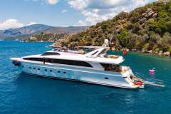 Presented by DMA Yachting, the impressive charter yacht BLUES is a 100 ft motor yacht. The highlights of BLUES are her generous space and inviting socializing areas. BLUES spends the summer and winter season in Turkey. She was completed by the ship builder SES MARINE TUZLA in 1997. A succesful refit was fulfilled in 2023. The expansive yacht layout features 5 cozy cabins and easily accommodates up to 10 guests.