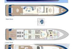 1 x Master cabin (Bed dimensions: 2,00m x 2,00m)2 x Double cabins (Bed dimensions: 2,00m x 0,90m)