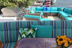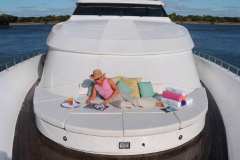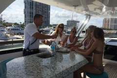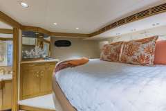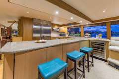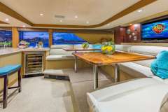 The flybridge has a fiberglass hardtop with retractable sun roof and 62" plasma TV which is recessed in the overhead just above the helm station. There is a 2 1/2' extension on the transom which houses a fully hydraulic set of stairs and underwater platform for swimming and personal watercraft access. Underwater lights located on the swim platform will provide hours of evening underwater viewing.