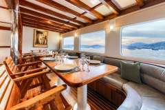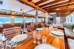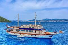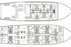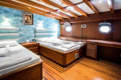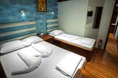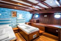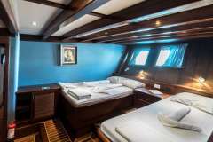 The boat has 6 doubles, 2 twins and 8 triple cabins. The twin cabins can be converted into double. Up to 36 guests. The cabins are very large and confortable. The 6 doubles are on upper deck.