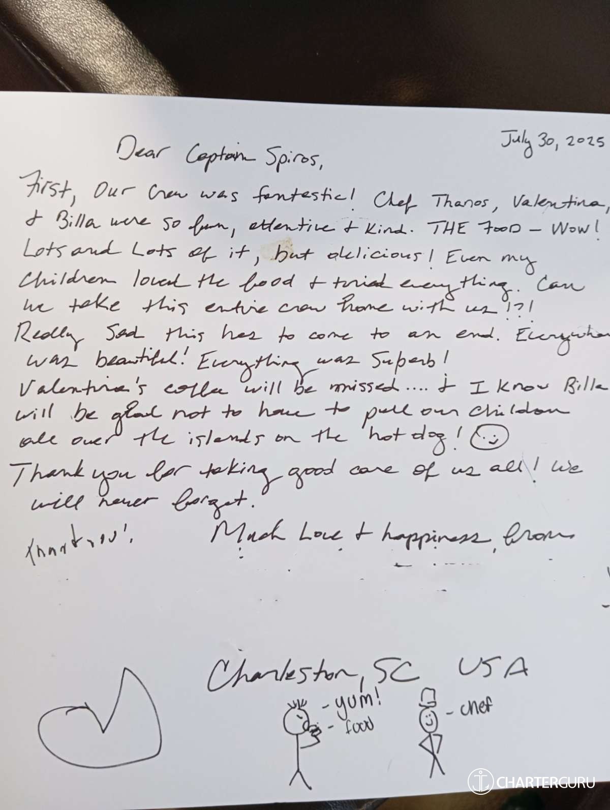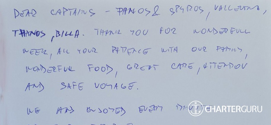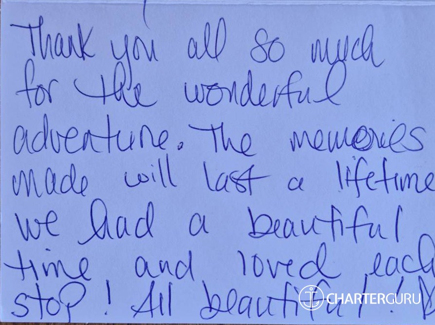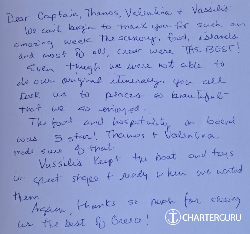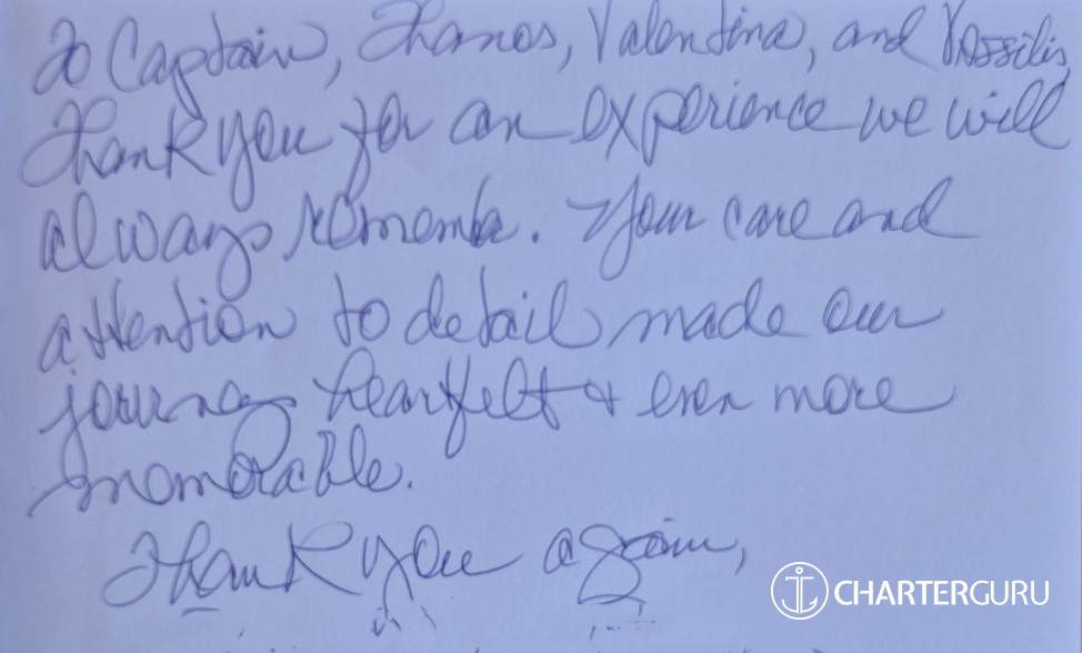Thank you all so much for a wonderful week on board. We were all very comfortable and happy. The crew was fabulous. Captain, thank you for taking the extra time and effort to explain the places to us, making us more comfortable selling your beautiful country to our clients. Chef, thank you for the fabulous food and for giving us the traditional Greek food experience. Billy, thank you for always having a patient manner and for waiting for us when we want to swim in the very fresh water. Mila, thank you for your service and kind nature You did a great job with summer.