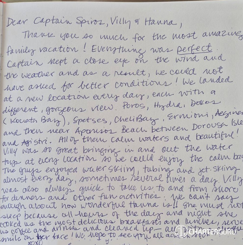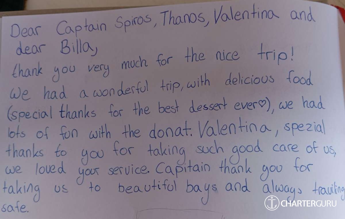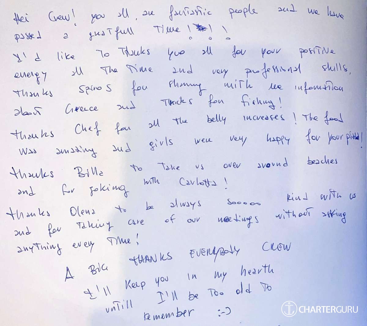 Thank you all so much for a wonderful week on board. We were all very comfortable and happy. The crew was fabulous. Captain, thank you for taking the extra time and effort to explain the places to us, making us more comfortable selling your beautiful country to our clients. Chef, thank you for the fabulous food and for giving us the traditional Greek food experience. Billy, thank you for always having a patient manner and for waiting for us when we want to swim in the very fresh water. Mila, thank you for your service and kind nature You did a great job with summer.