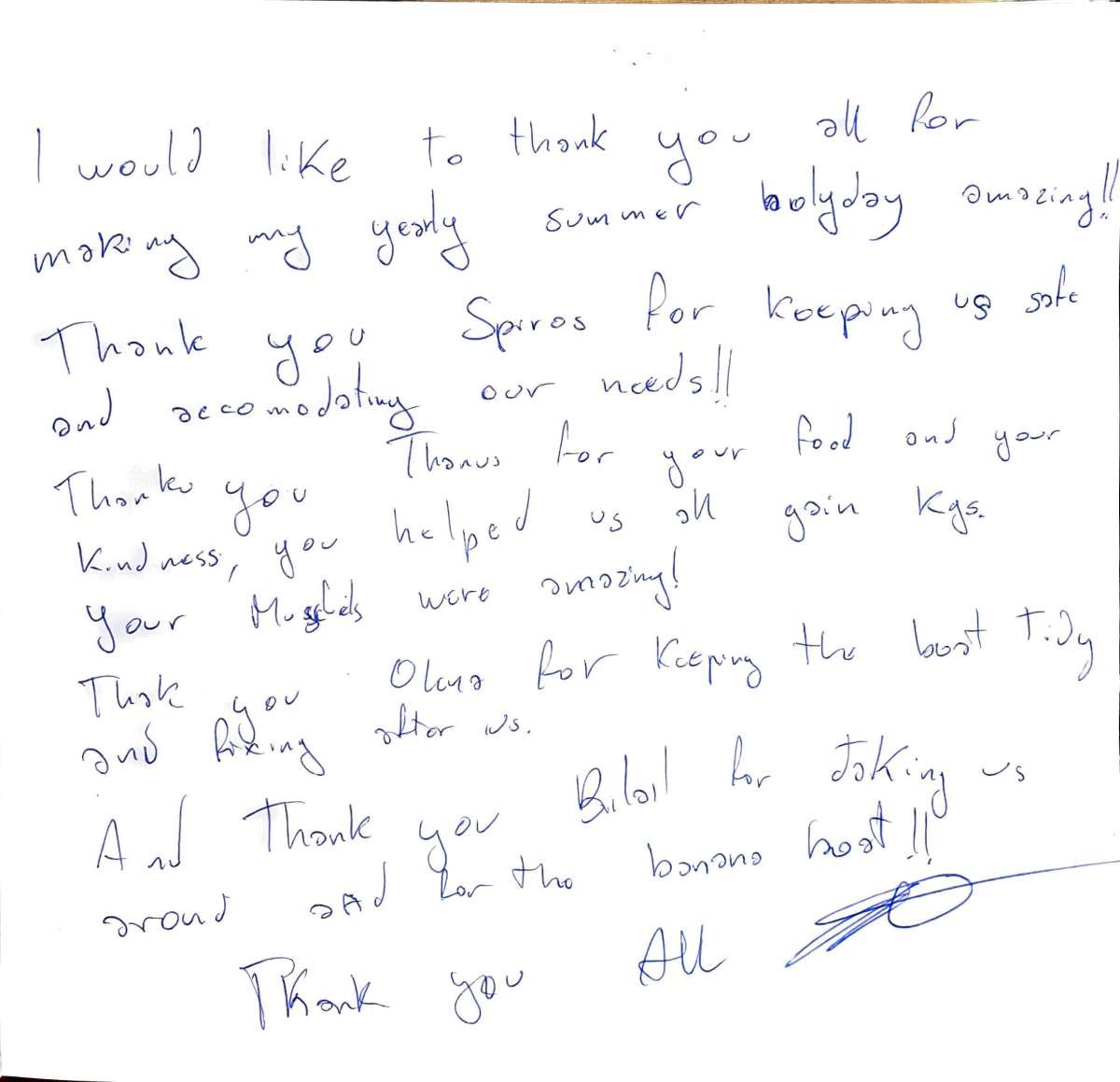 We thank you for the most wonderful week, which would not have been so wonderful without such a lovely, friendly crew. The food was wonderful and we are so grateful that all our food preferences we were so carefully covered for. It is never easy cooking for people who can cook and grow their own food, so have high expectations but Apostolis succeeded.