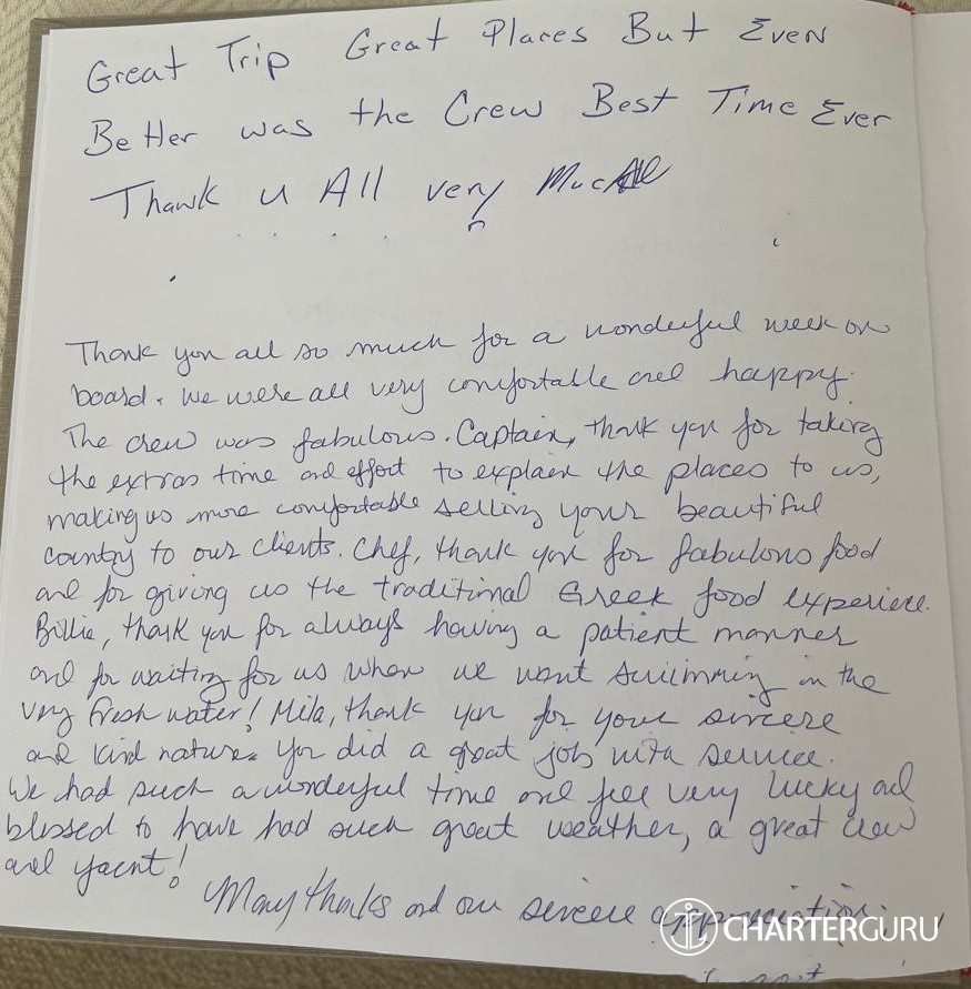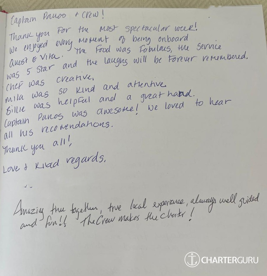 Thank you all so much for a wonderful week on board. We were all very comfortable and happy. The crew was fabulous. Captain, thank you for taking the extra time and effort to explain the places to us, making us more comfortable selling your beautiful country to our clients. Chef, thank you for the fabulous food and for giving us the traditional Greek food experience. Billy, thank you for always having a patient manner and for waiting for us when we want to swim in the very fresh water. Mila, thank you for your service and kind nature You did a great job with summer.