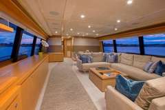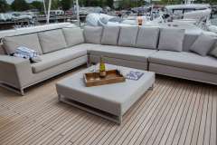 A 4 cabin layout offers accommodations for 6 guests. Her master cabin features a king size bed. Additionally, there are two cabins each with a queen bed and a cabin with two singles. The main salon offers a formal dining table next to the window to host an elegant dinner with great views. On the aft deck, there is al fresco dining with a lounge across the back for comfortable seating. The flybridge hosts an area for guests to relax and soak up the sun on a large, L-shaped lounge.