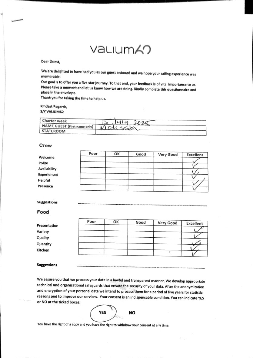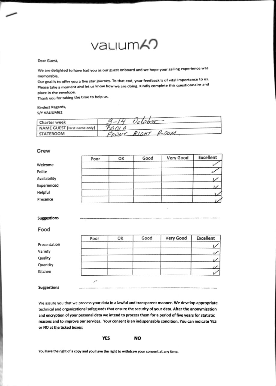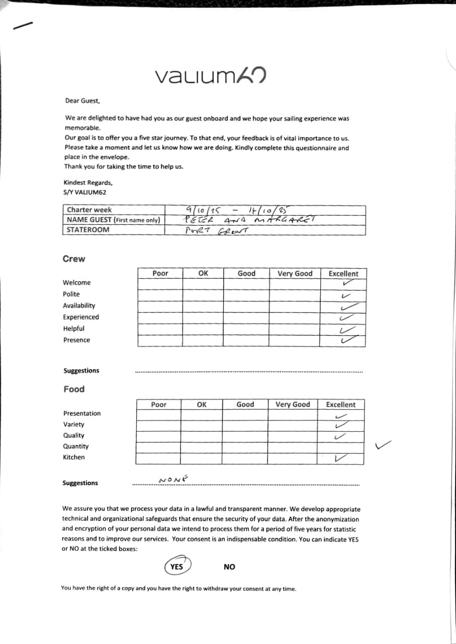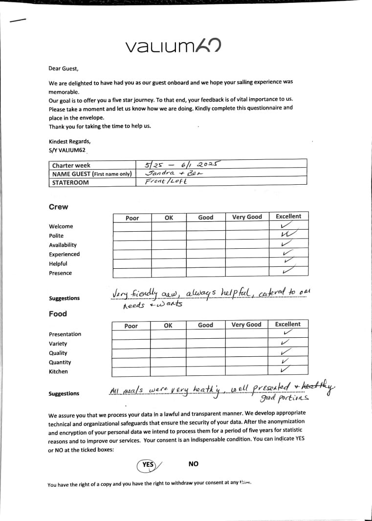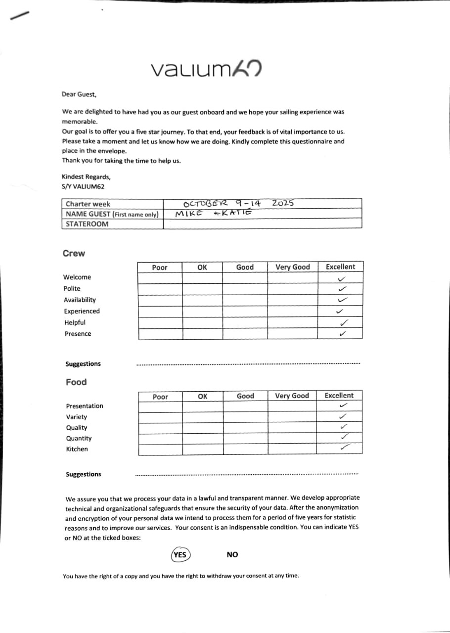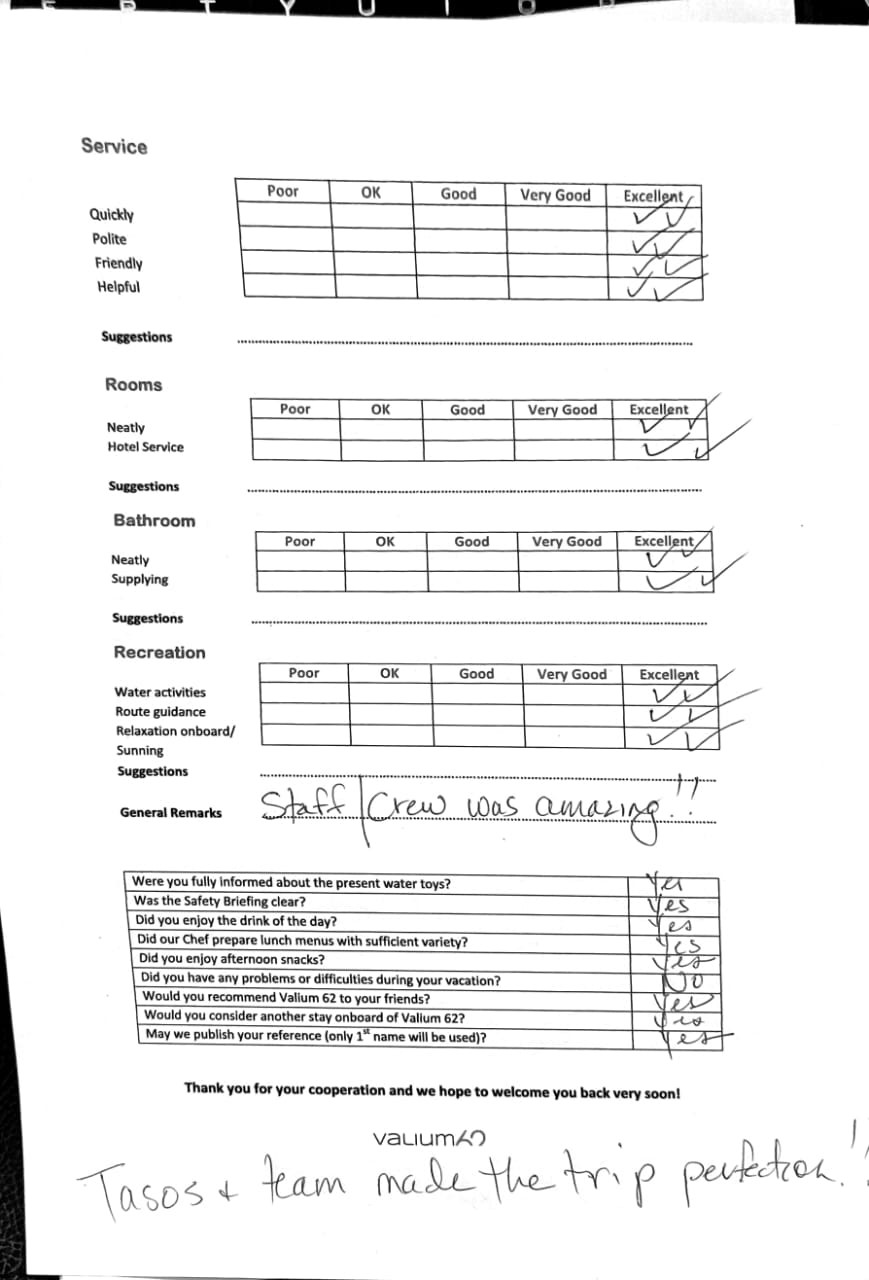 We would like to extend our aprreciation and thanks to entire team aboard the Valium 62 for the exceptional experience we had during our recent chartered cruise.
