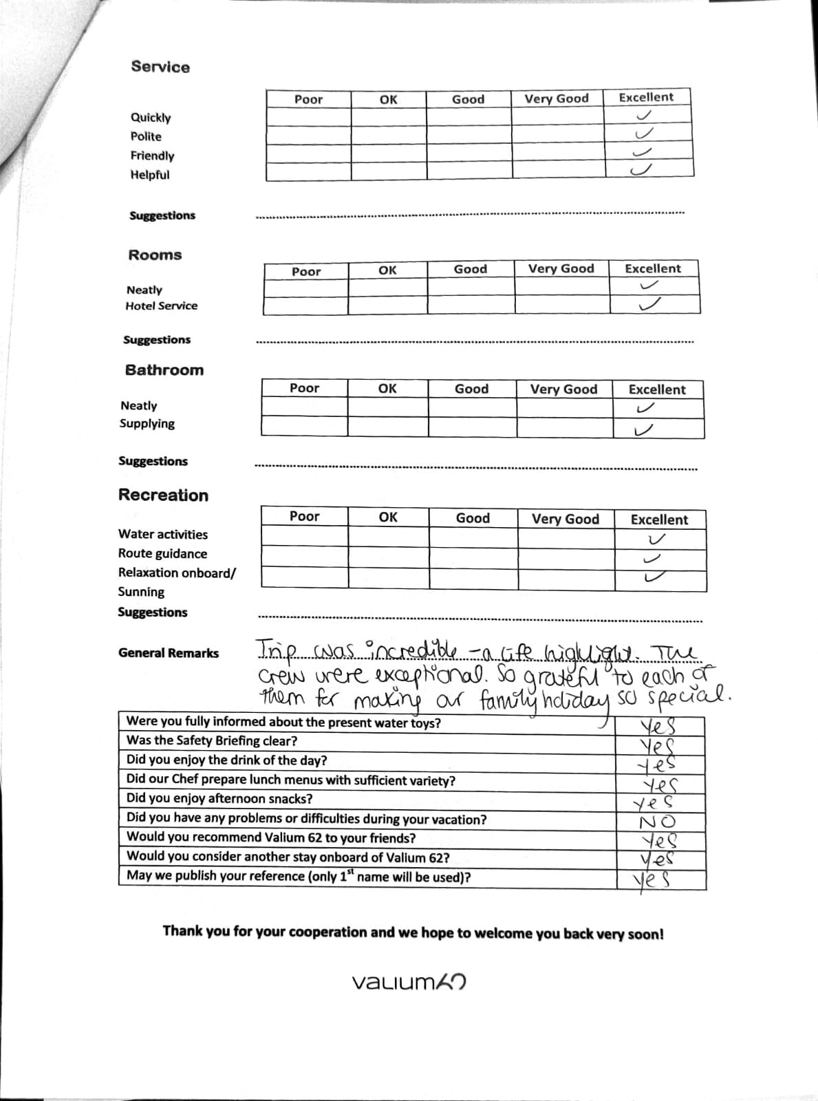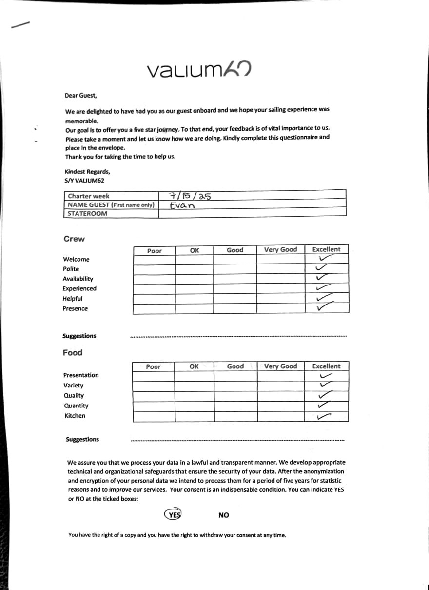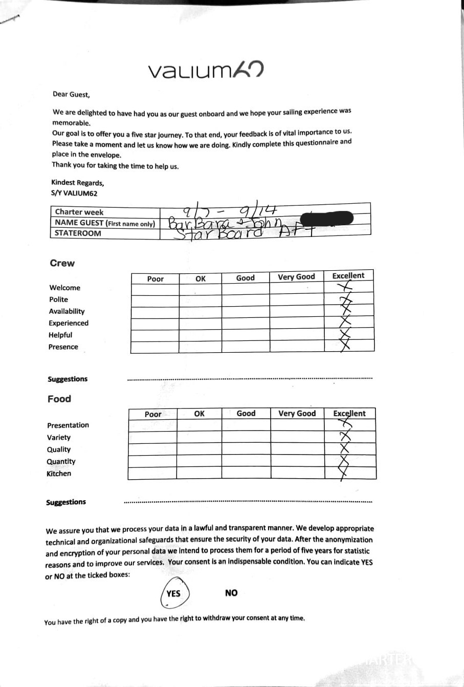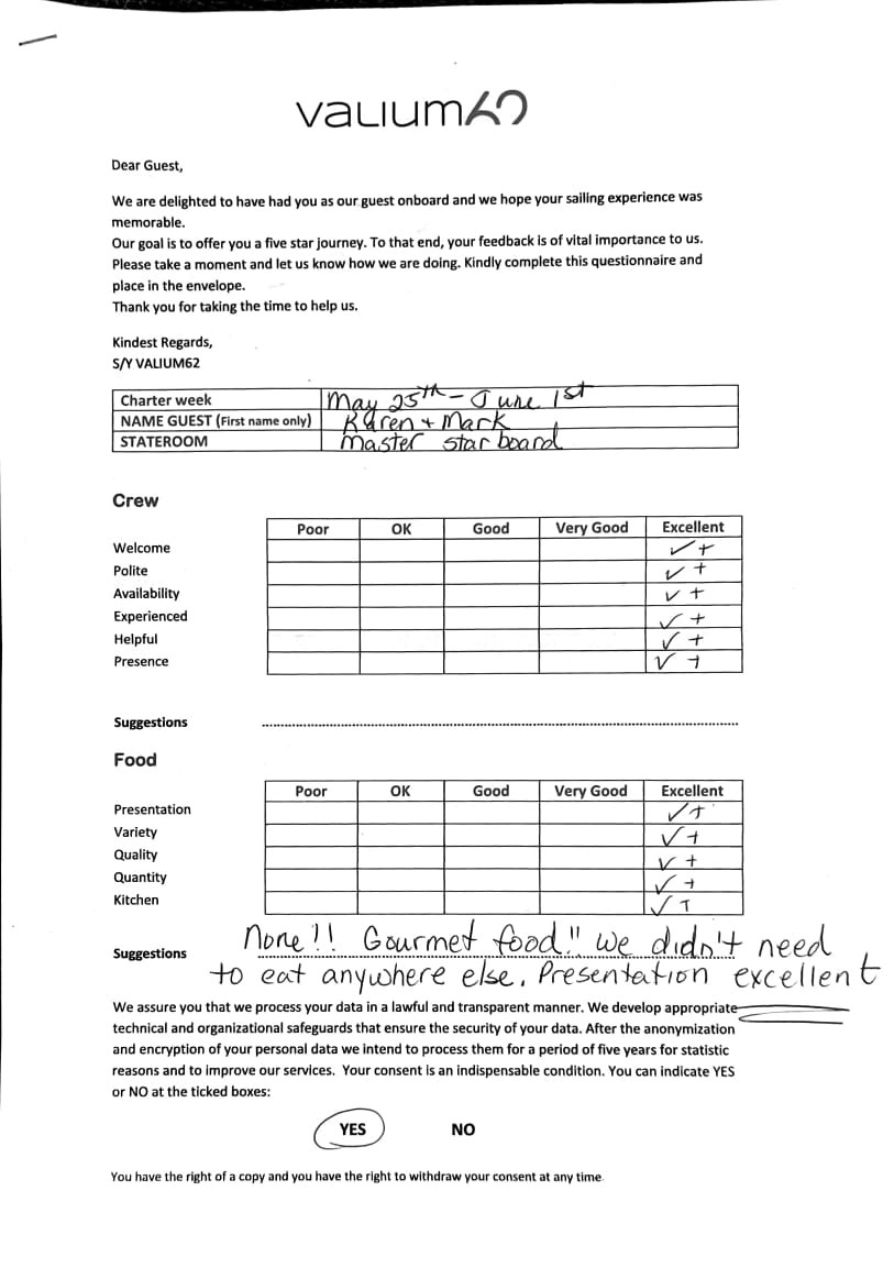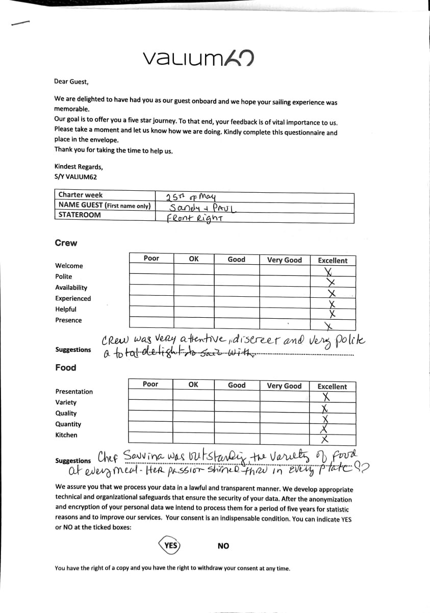 We would like to extend our aprreciation and thanks to entire team aboard the Valium 62 for the exceptional experience we had during our recent chartered cruise.