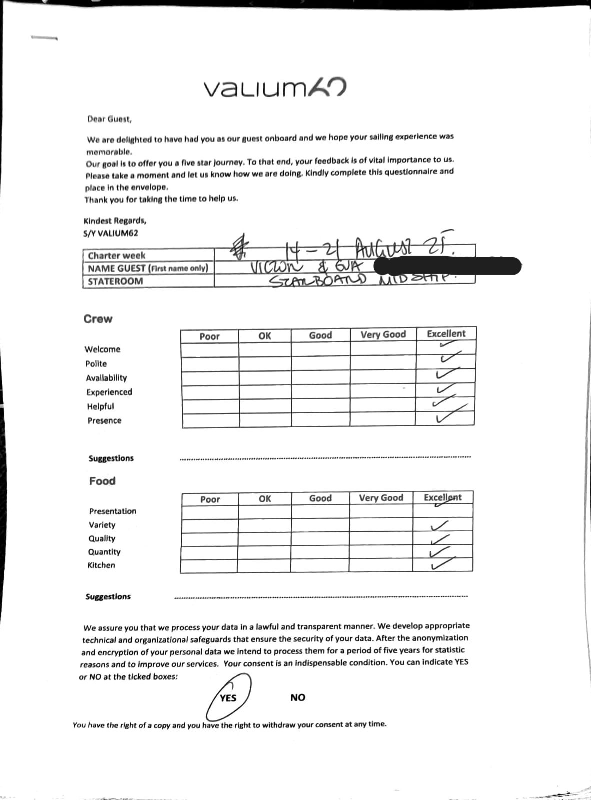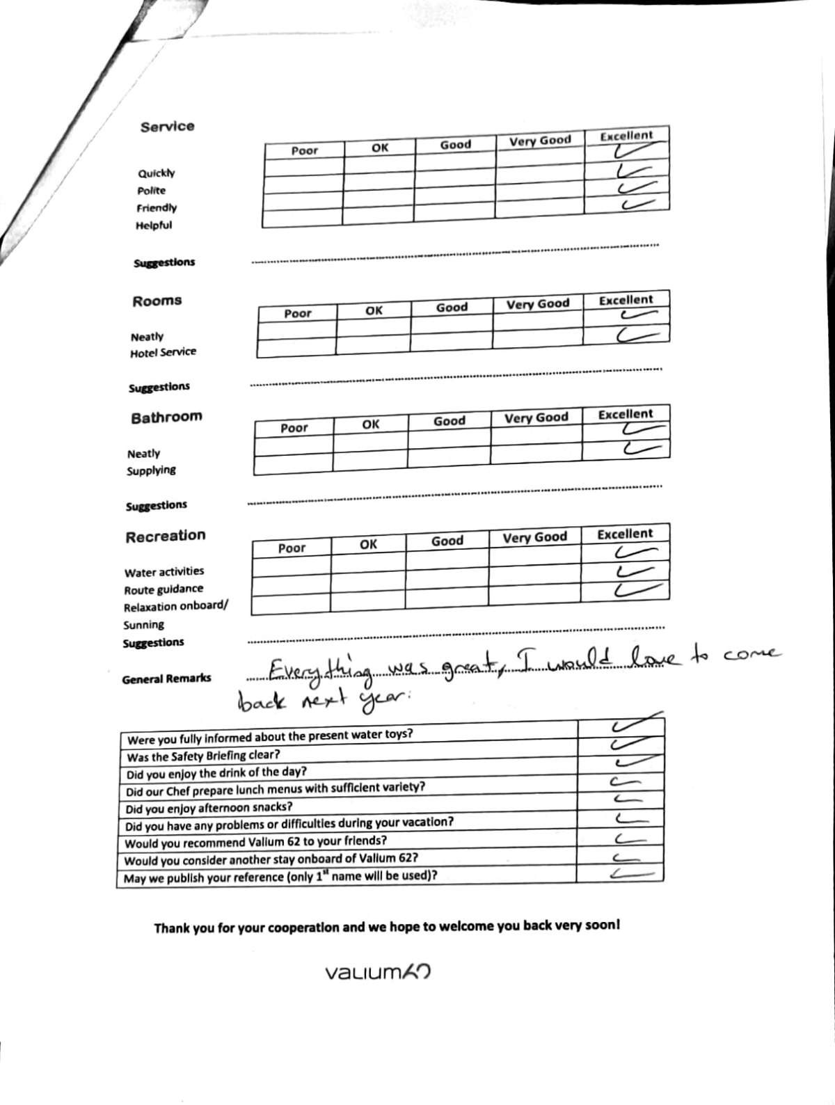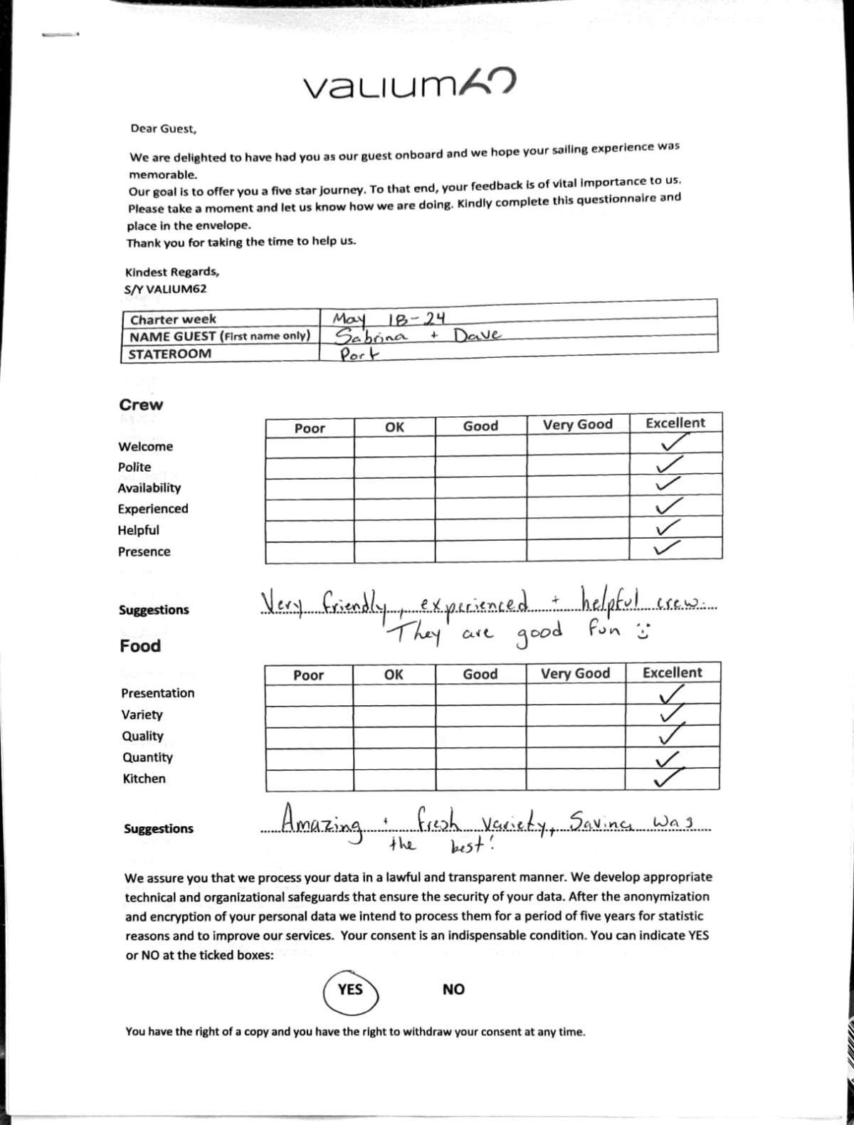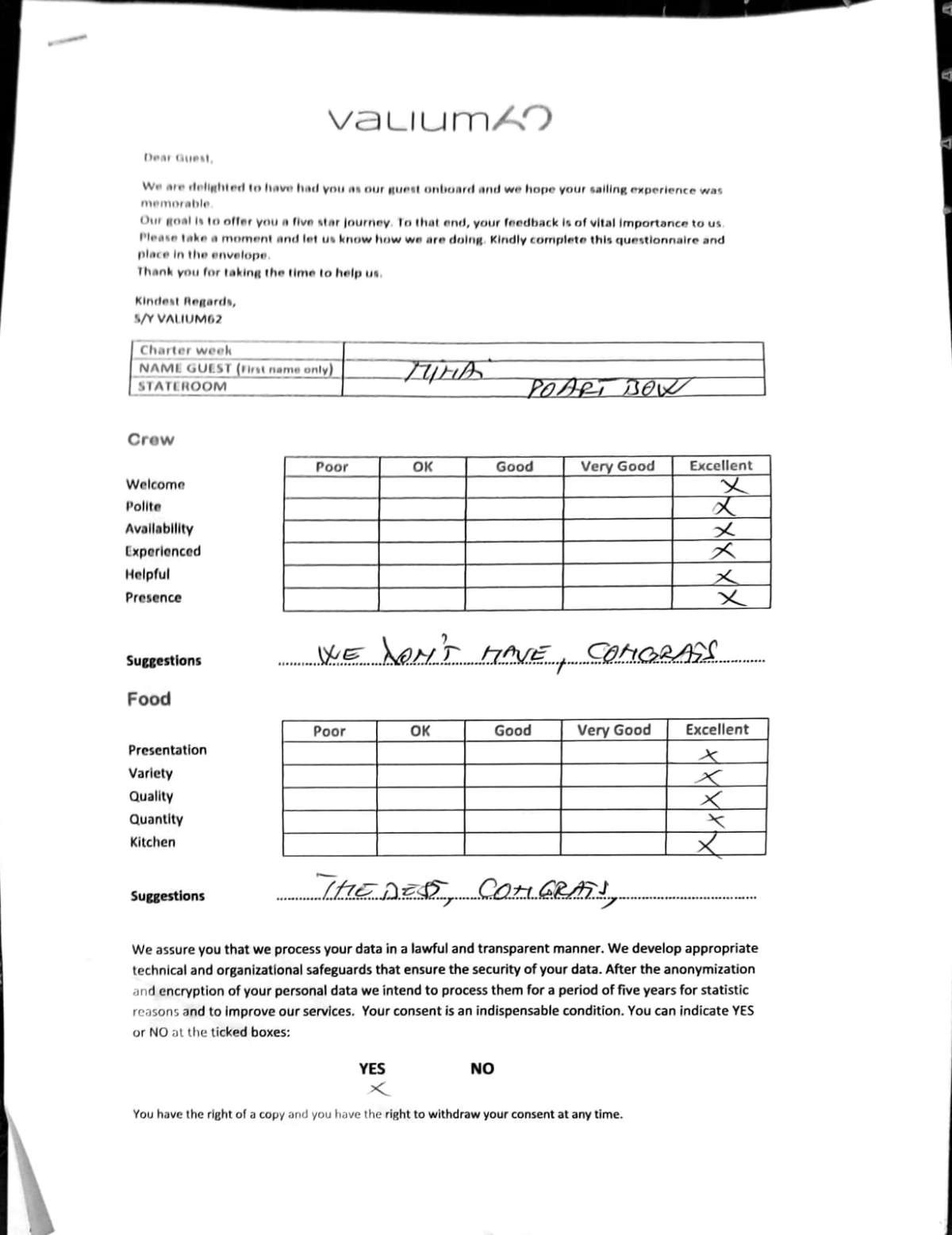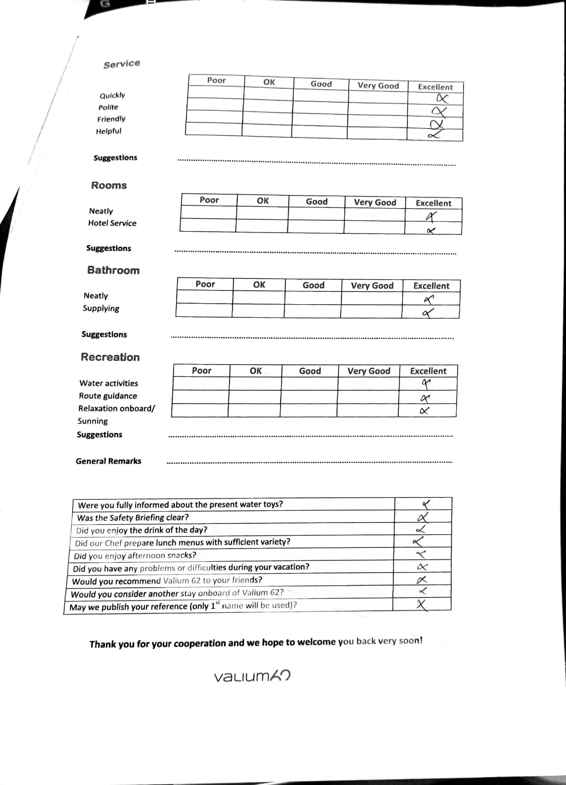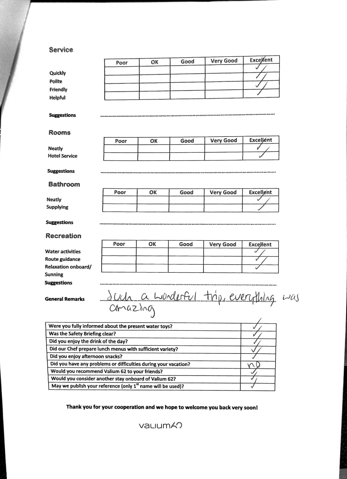 We would like to extend our aprreciation and thanks to entire team aboard the Valium 62 for the exceptional experience we had during our recent chartered cruise.