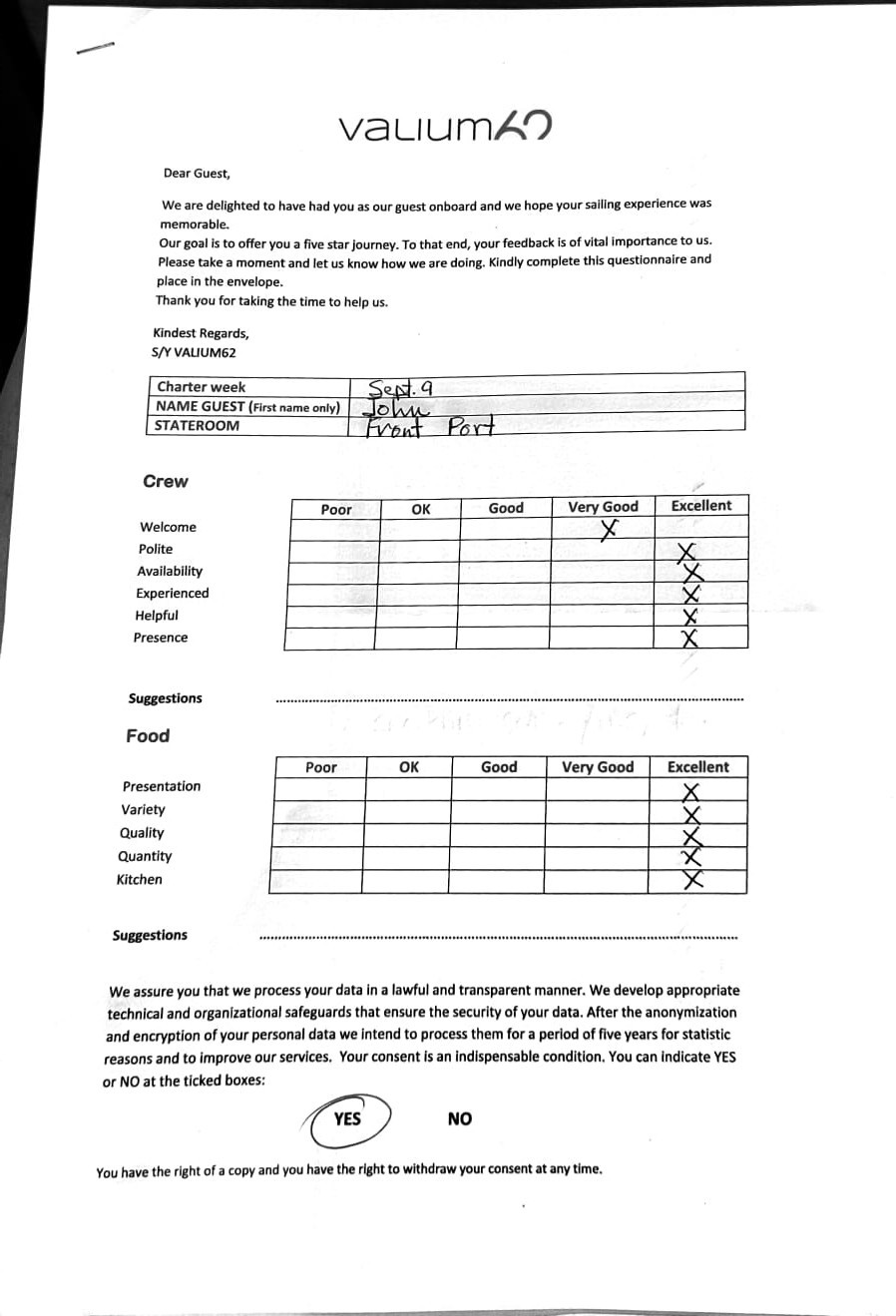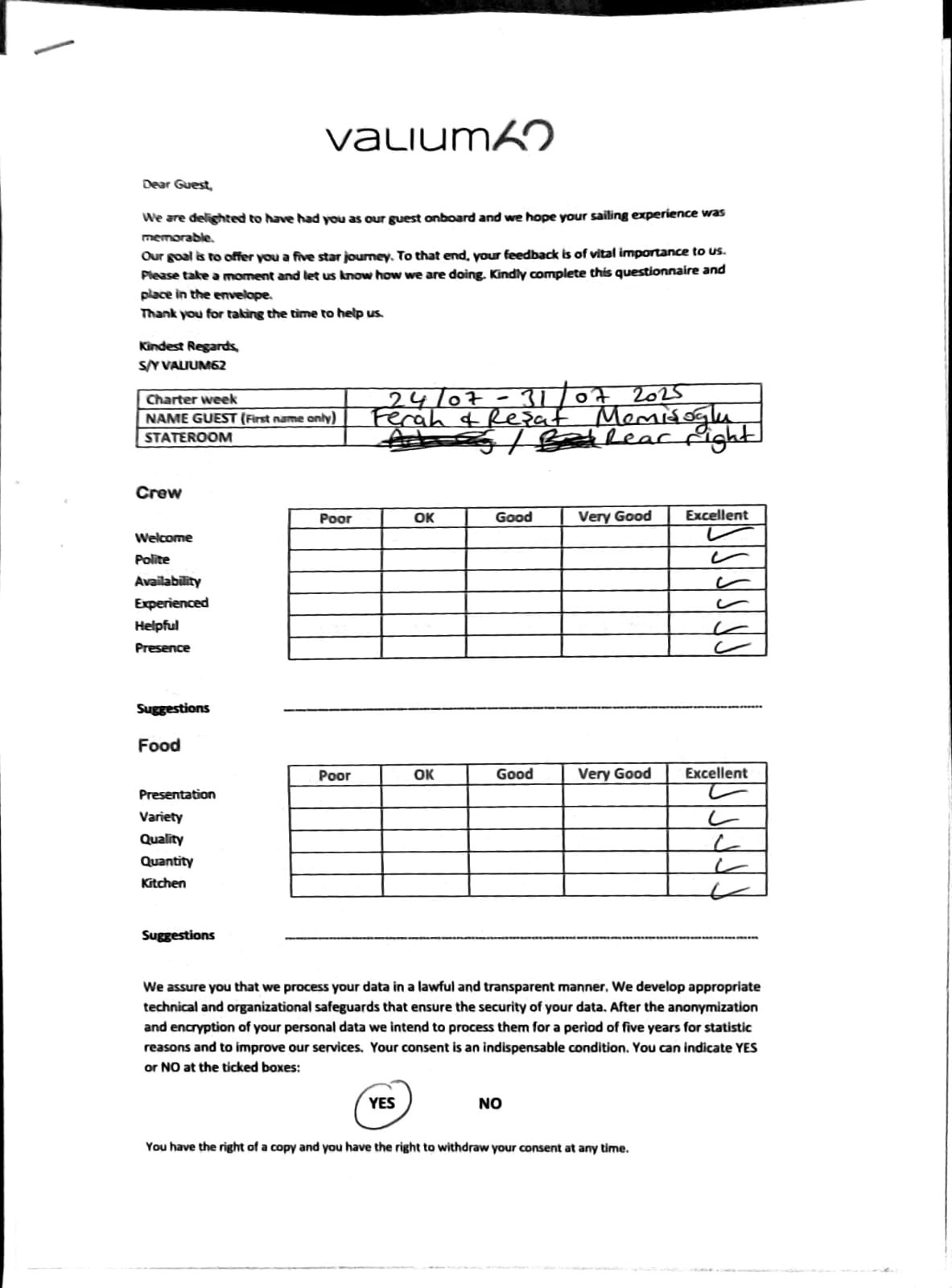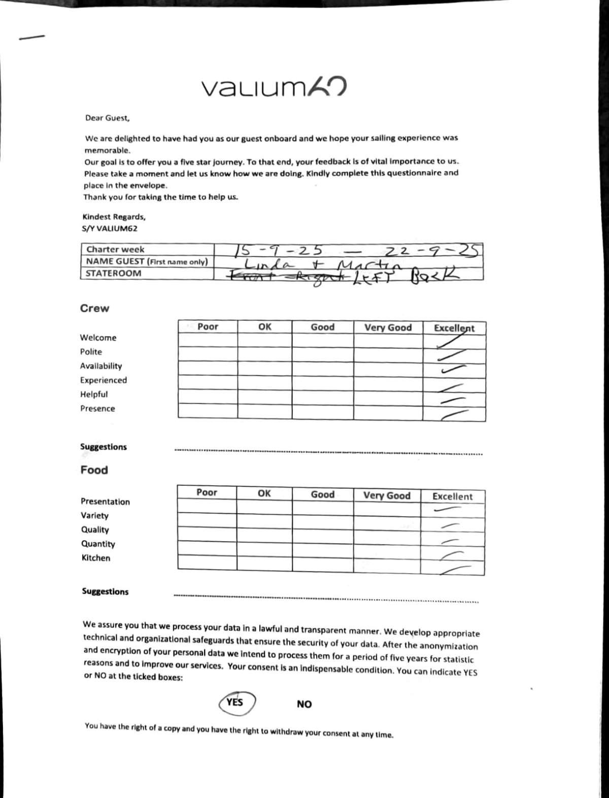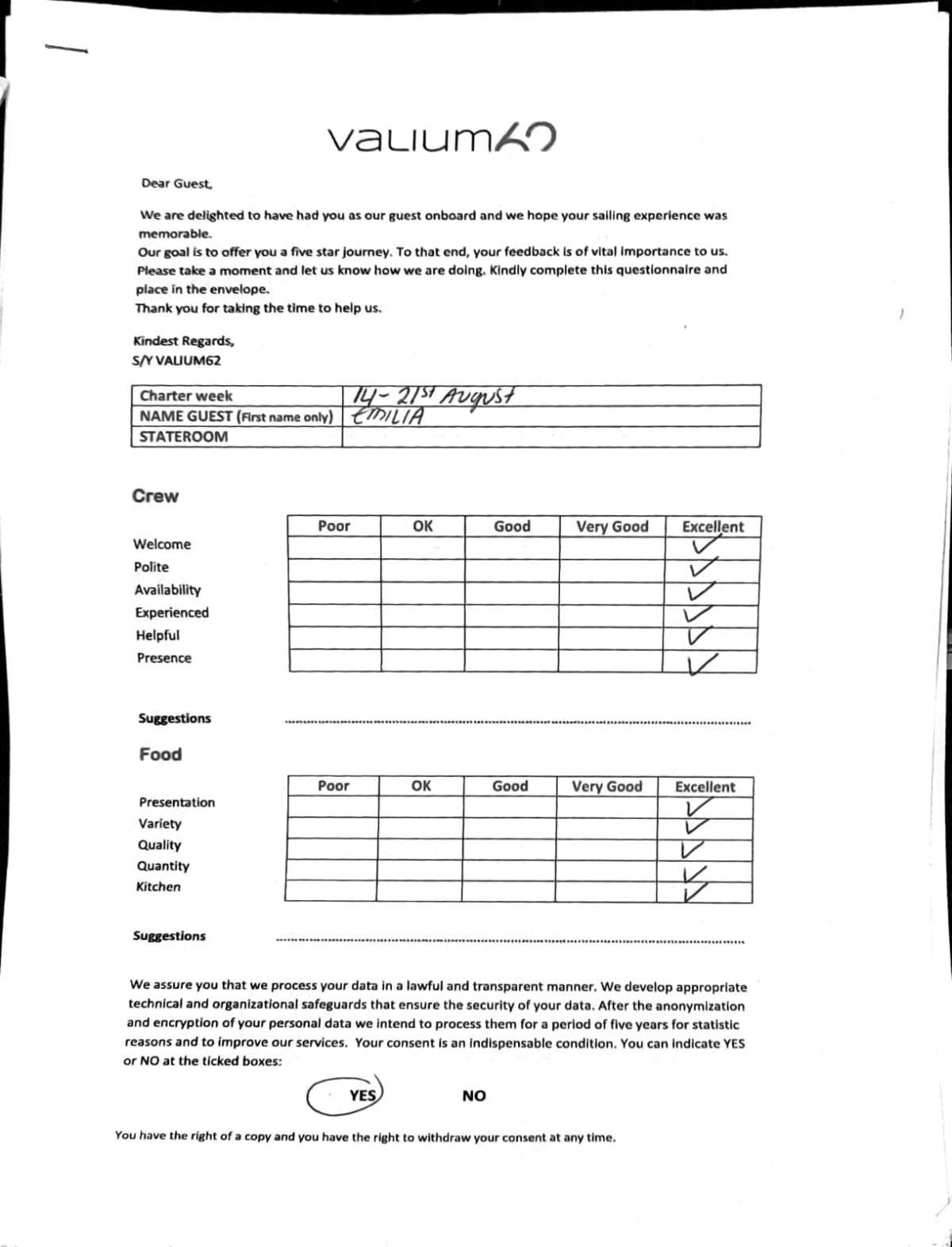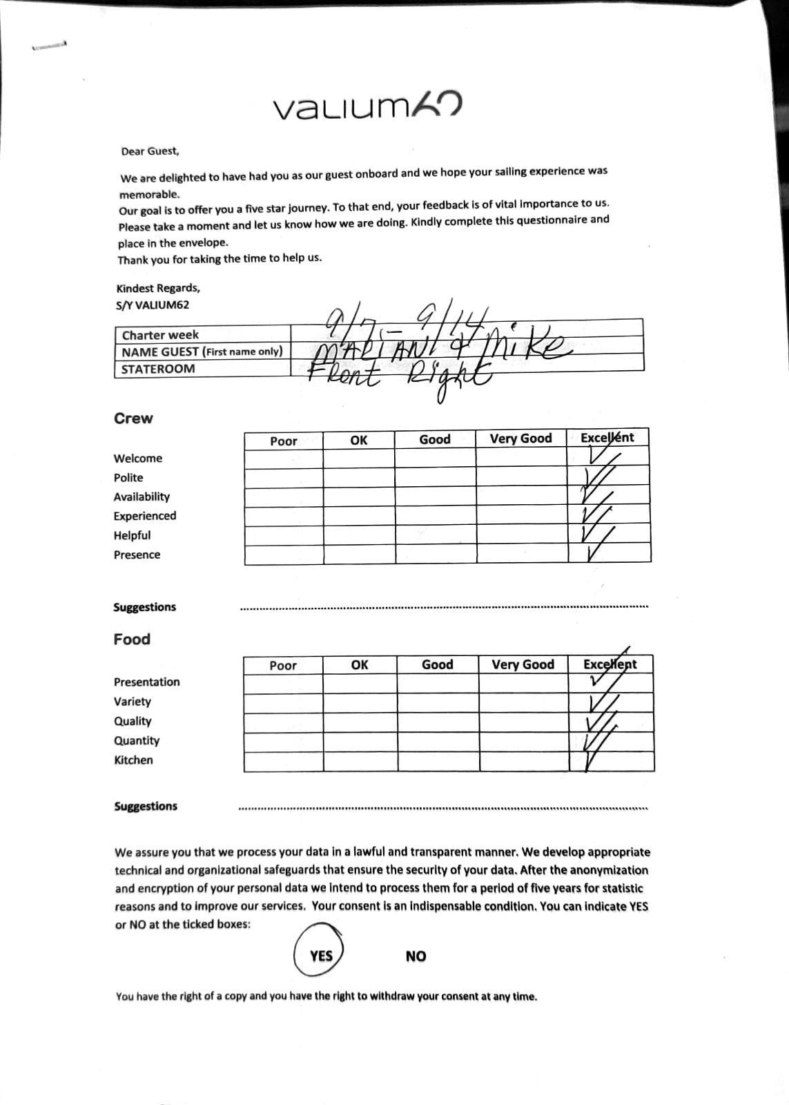 We would like to extend our aprreciation and thanks to entire team aboard the Valium 62 for the exceptional experience we had during our recent chartered cruise.