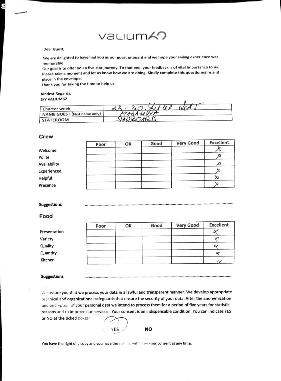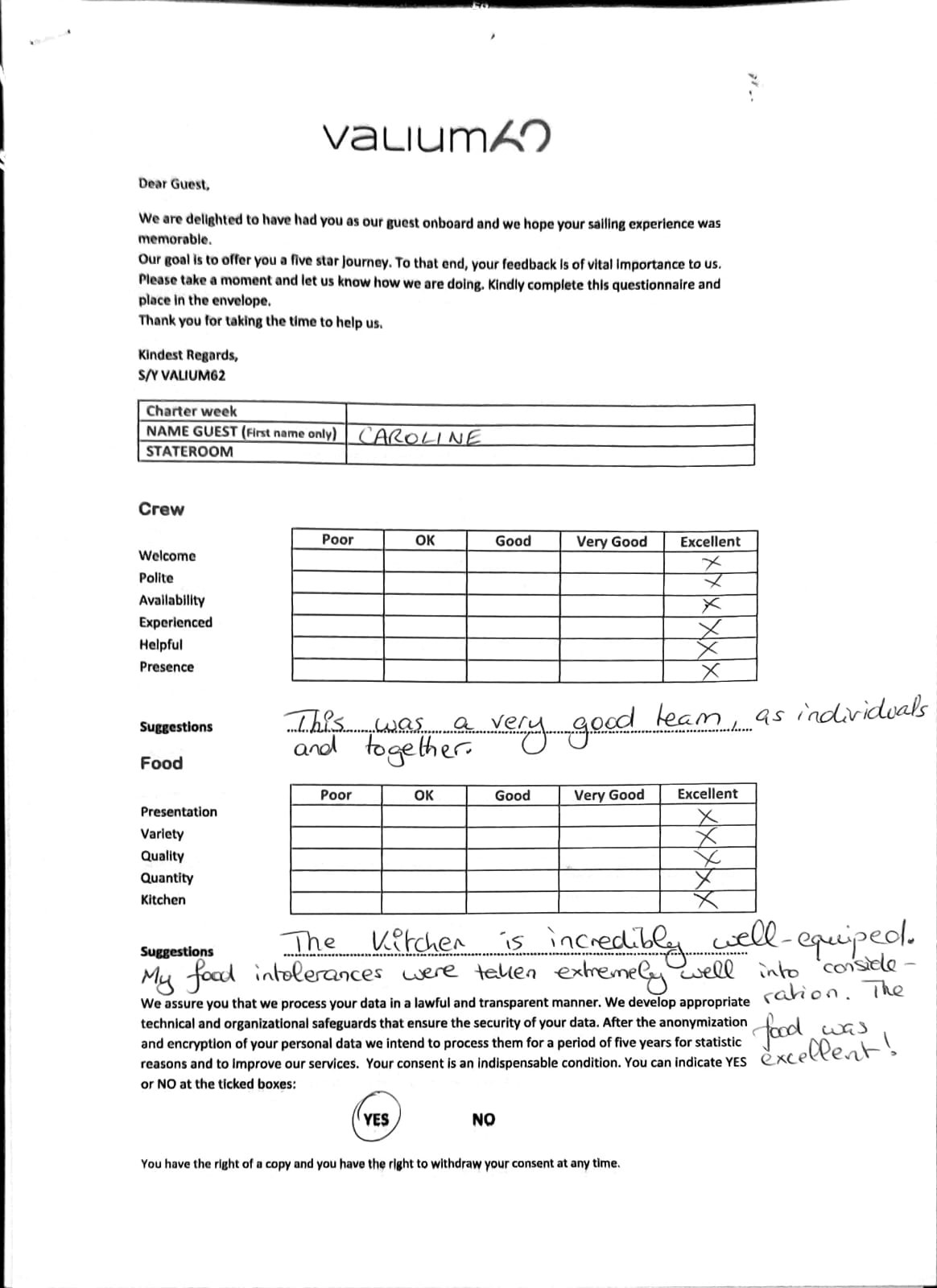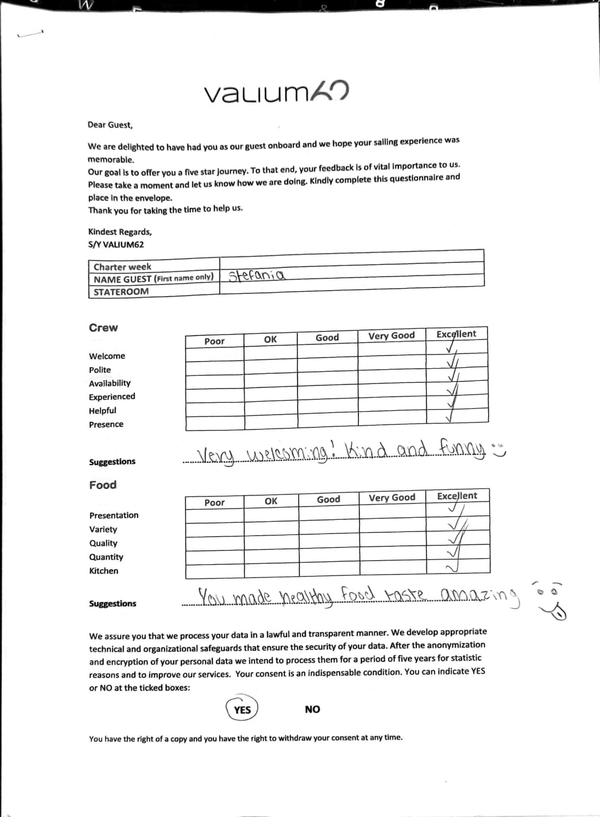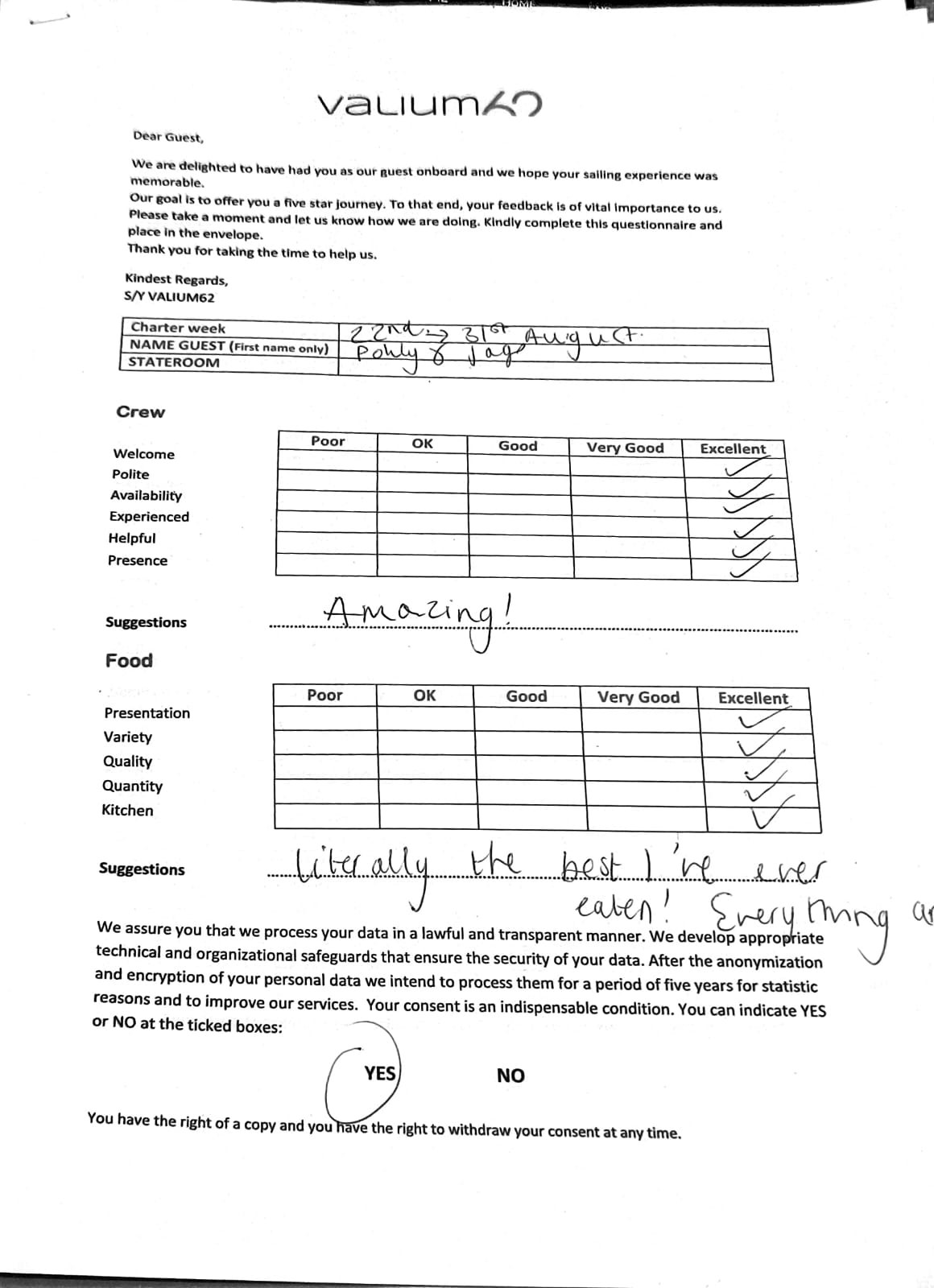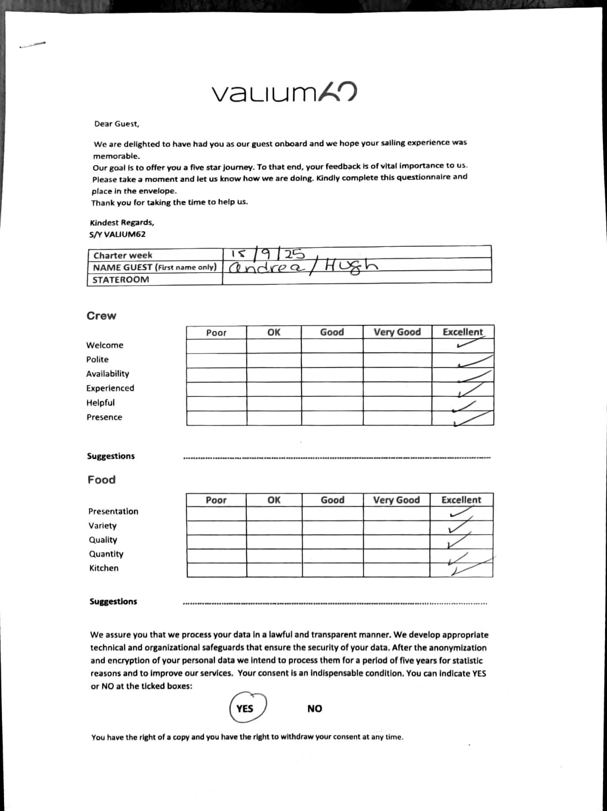 We would like to extend our aprreciation and thanks to entire team aboard the Valium 62 for the exceptional experience we had during our recent chartered cruise.