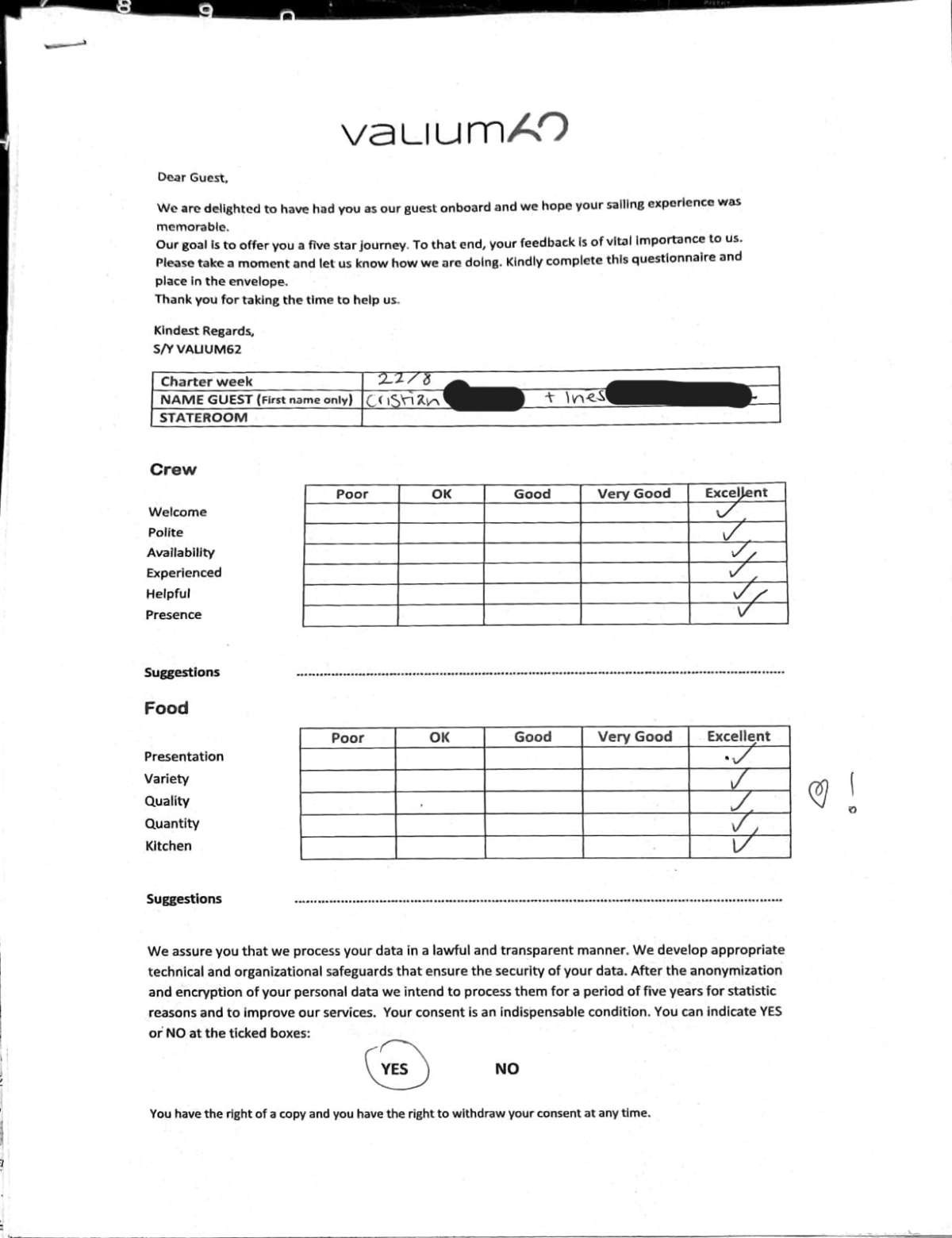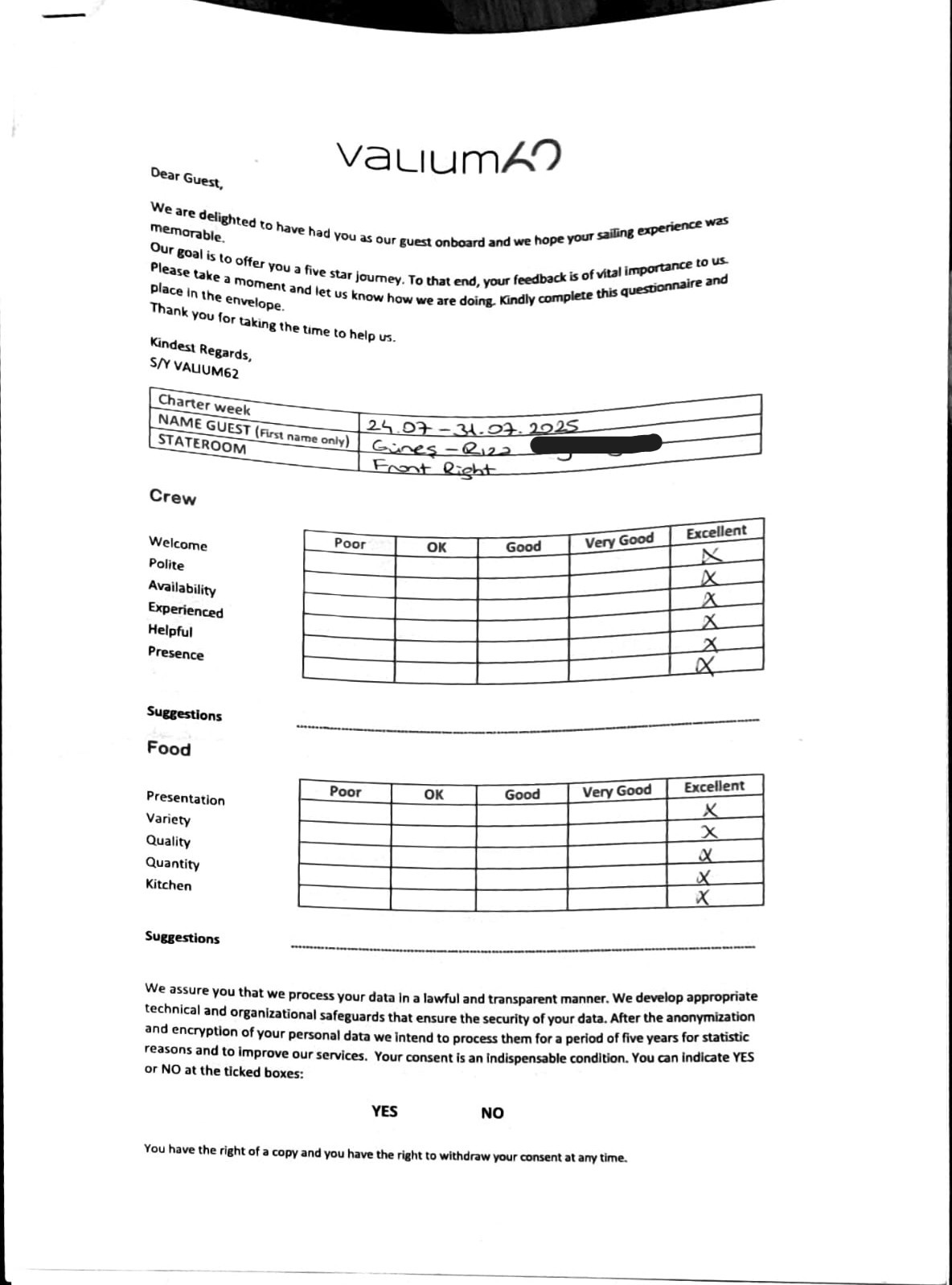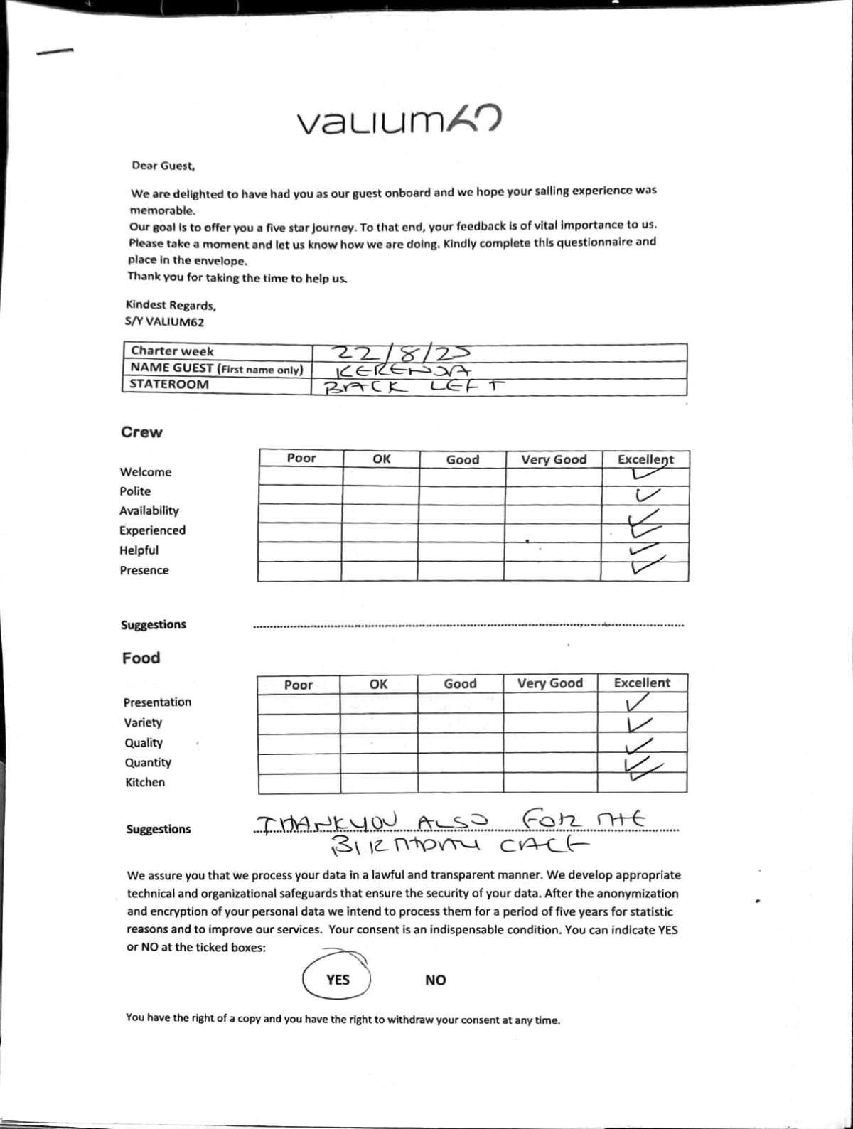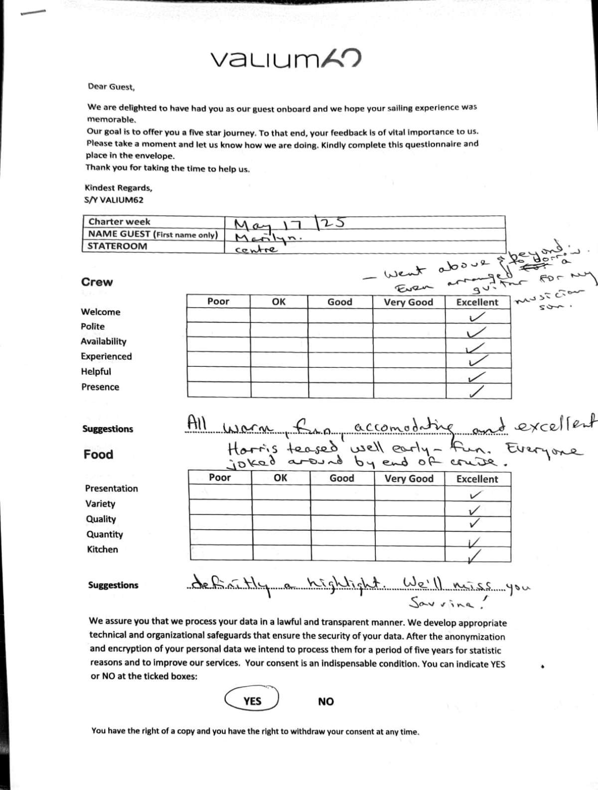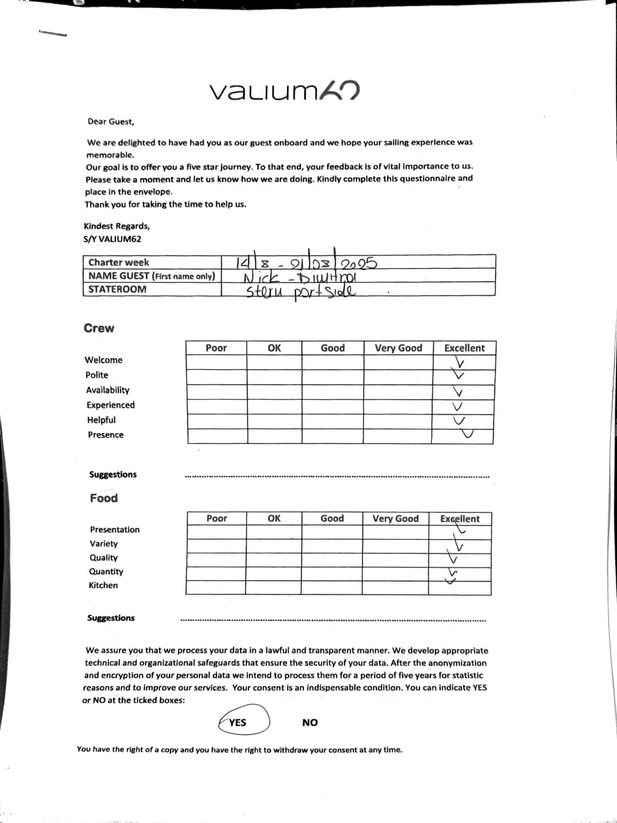 We would like to extend our aprreciation and thanks to entire team aboard the Valium 62 for the exceptional experience we had during our recent chartered cruise.